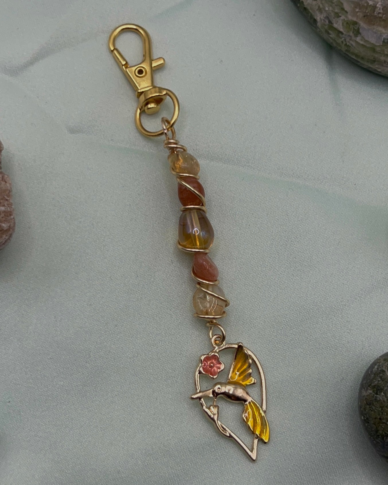 Keychain made with Sunstone crystal pebbles, and a hummingbird charm. Only one available.