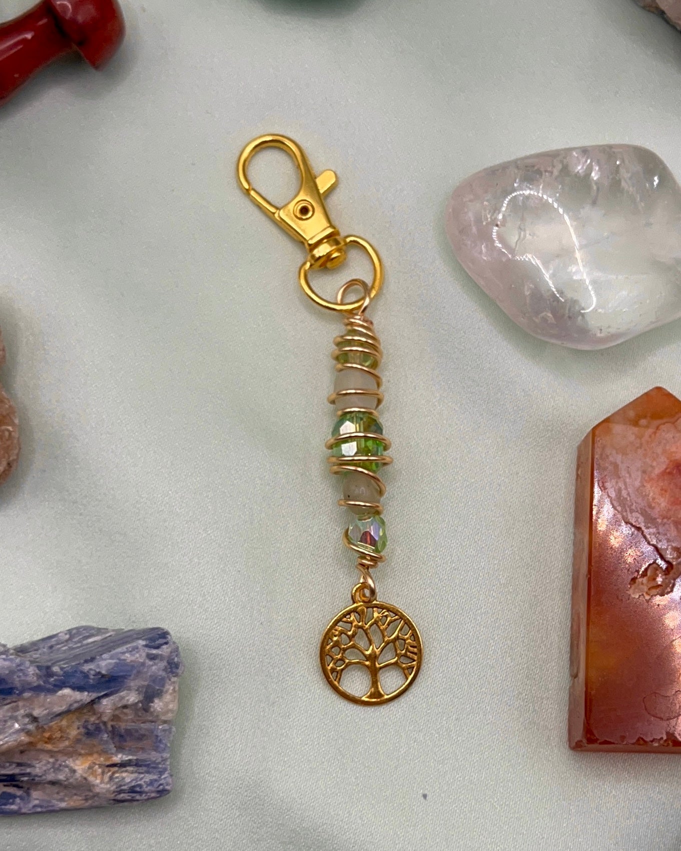 Keychain made with Jade pebbles, green beads and a tree of life charm. Only one available.