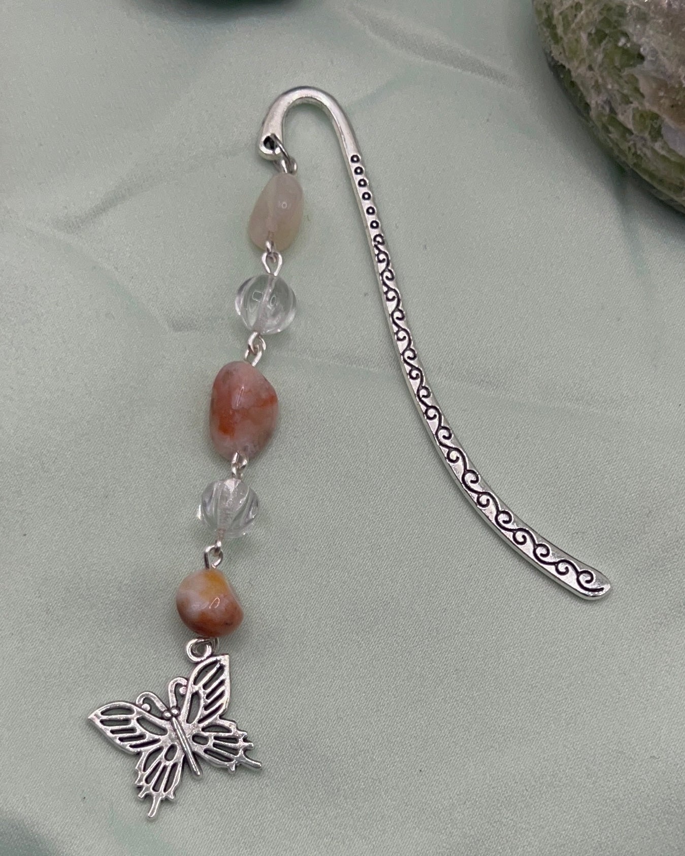 Bookmark made with Flower Agate crystal pebbles, clear faceted beads, and a butterfly charm. Only one available.