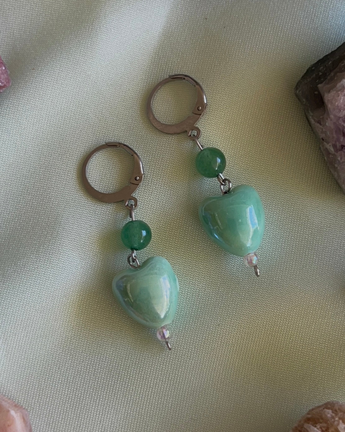 Earrings made with green heart and Green Aventurine crystal beads. Comes on stainless steel huggie hoops. Only one pair available.