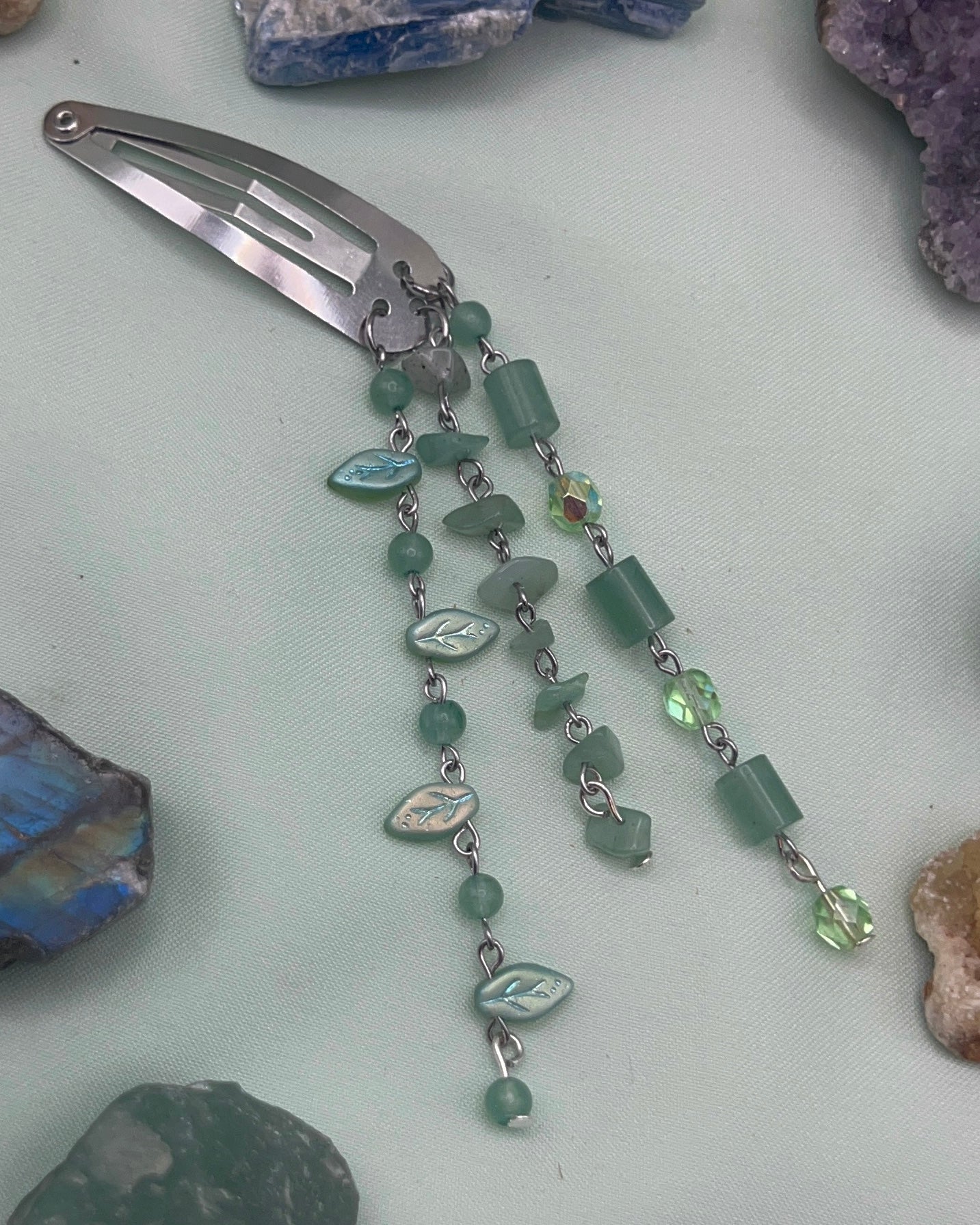 Hair clip made with Green Aventurine tubes and chips, leaf beads and green faceted beads. Fully stainless steel. Only one available.