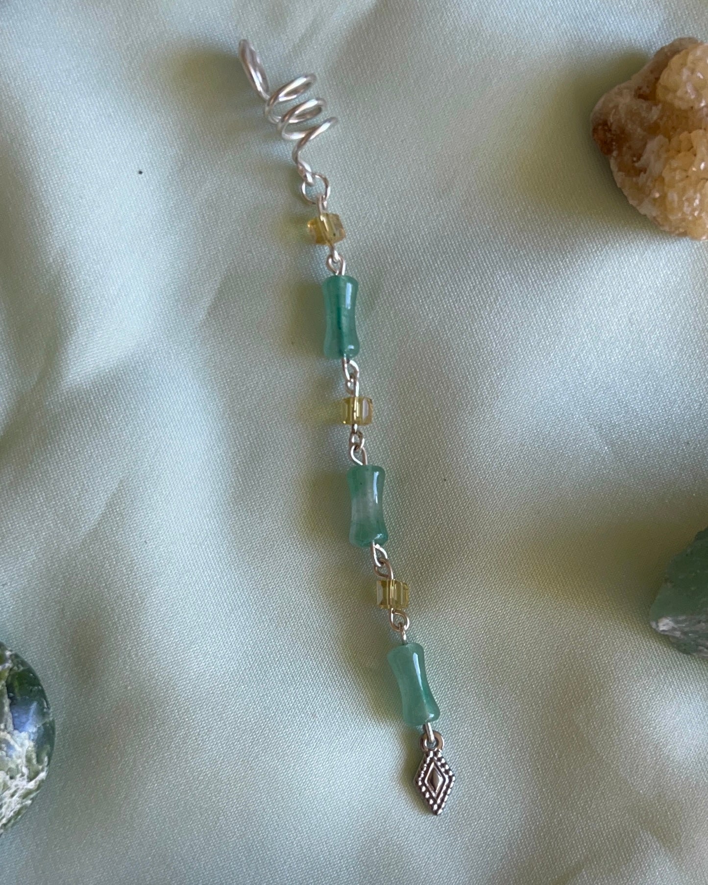 Hair charm made with Green Aventurine tube beads, yellow cube beads, a silver diamond charm and silver plated wire. Only one available.