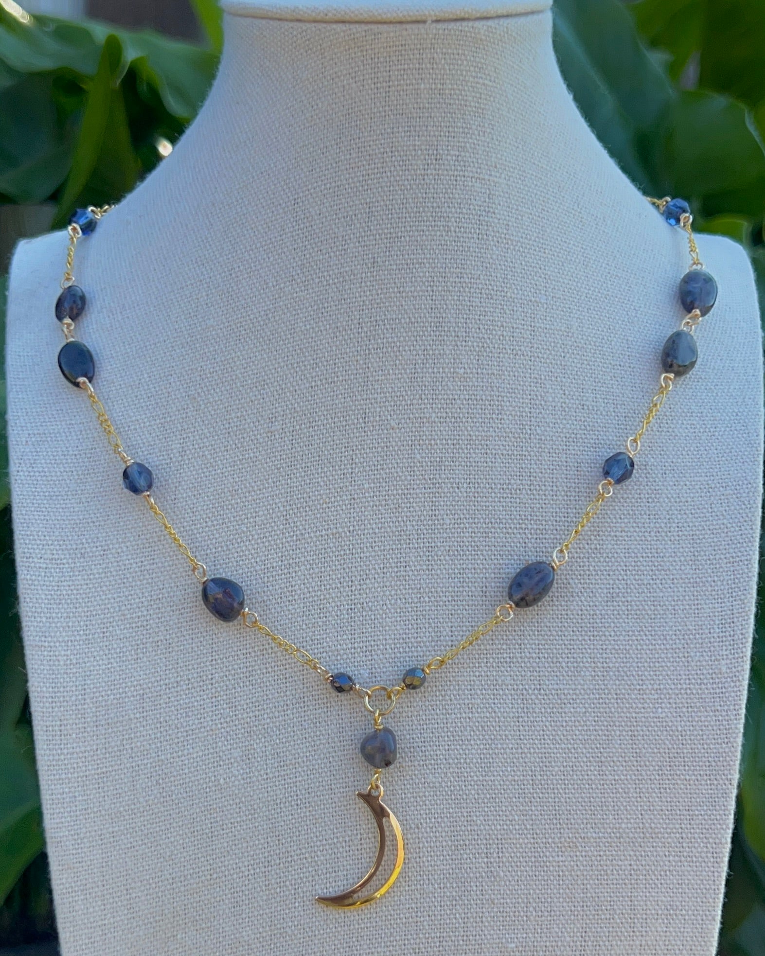 Necklace made with Iolite pebbles, black faceted beads, and a moon charm. Made with gold plated wire and chain.