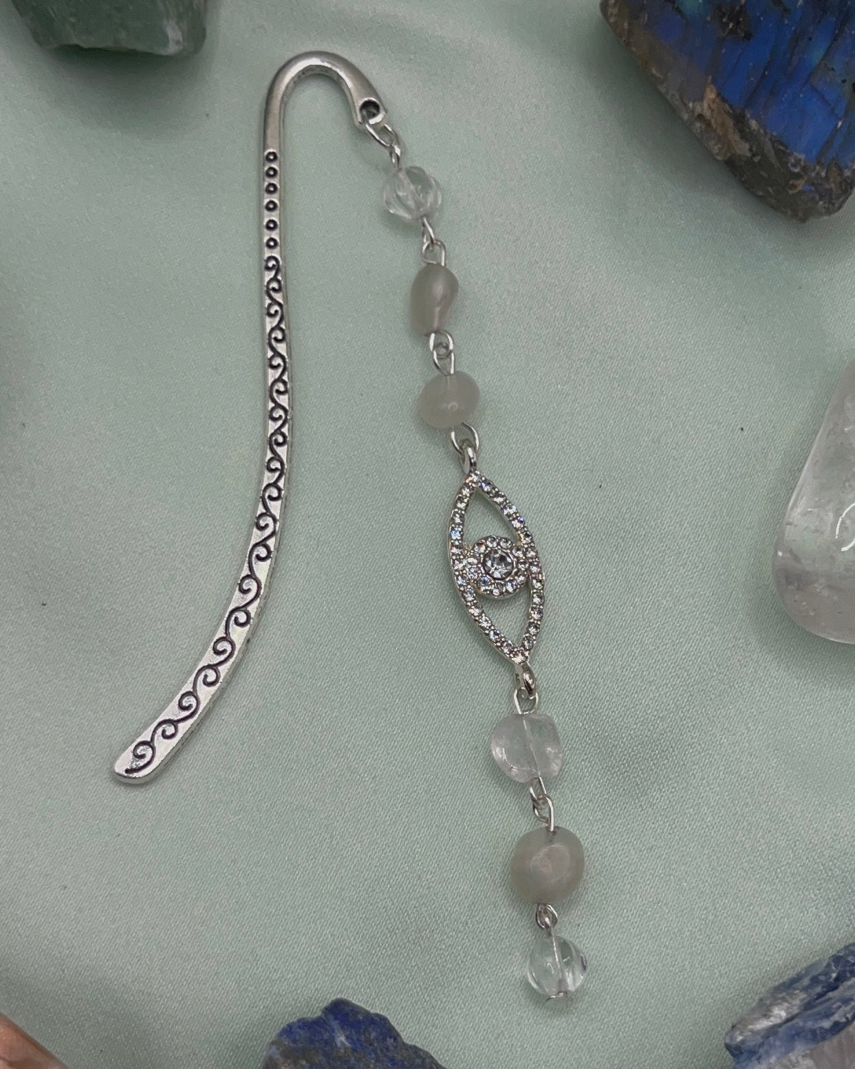 Bookmark made with Moonstone crystal pebbles, a diamond evil eye charm, and clear beads. Only one available.