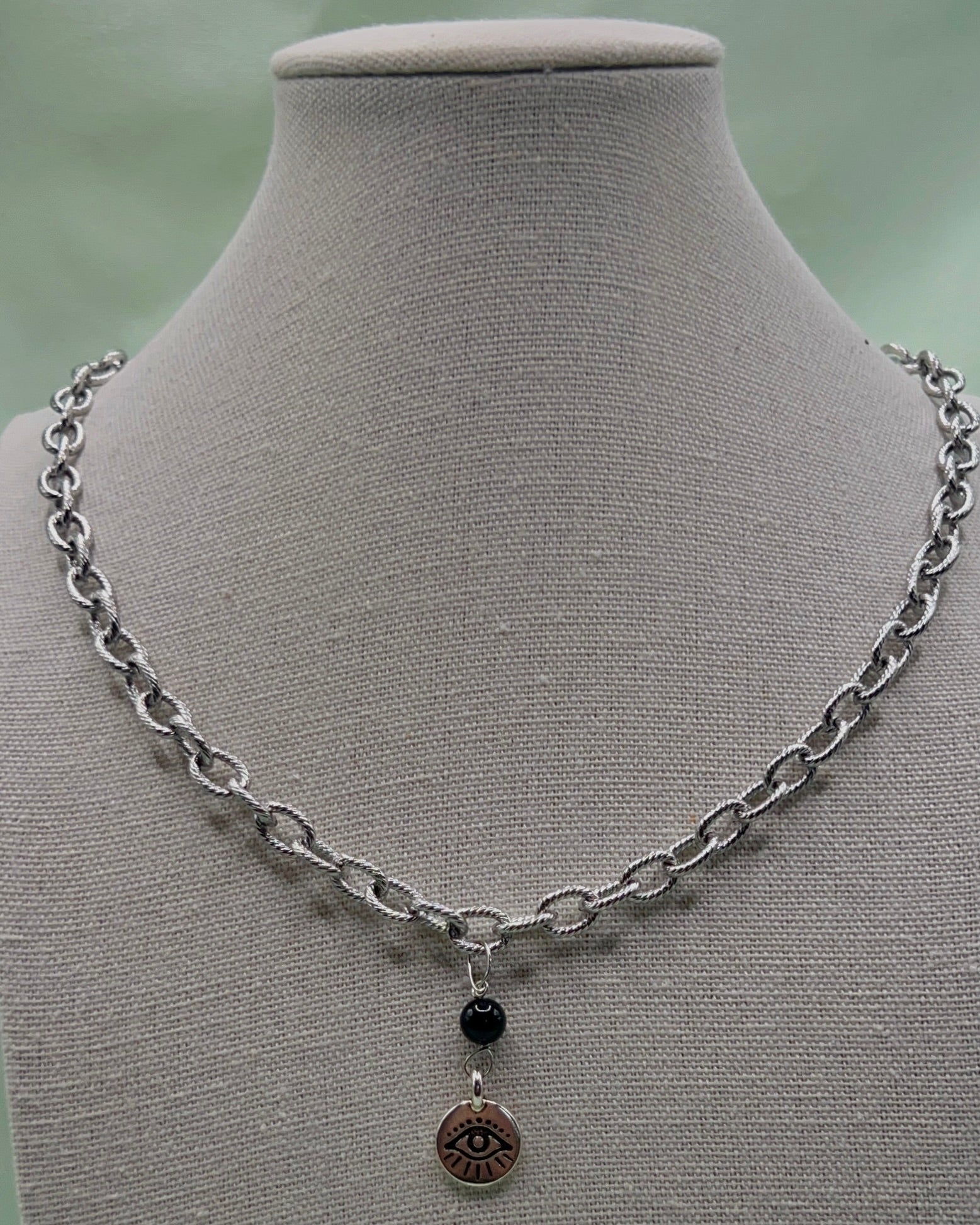 Necklace made with an Onyx crystal bead and evil eye charm. Necklace made with thick textured cable chain. Only one available.
