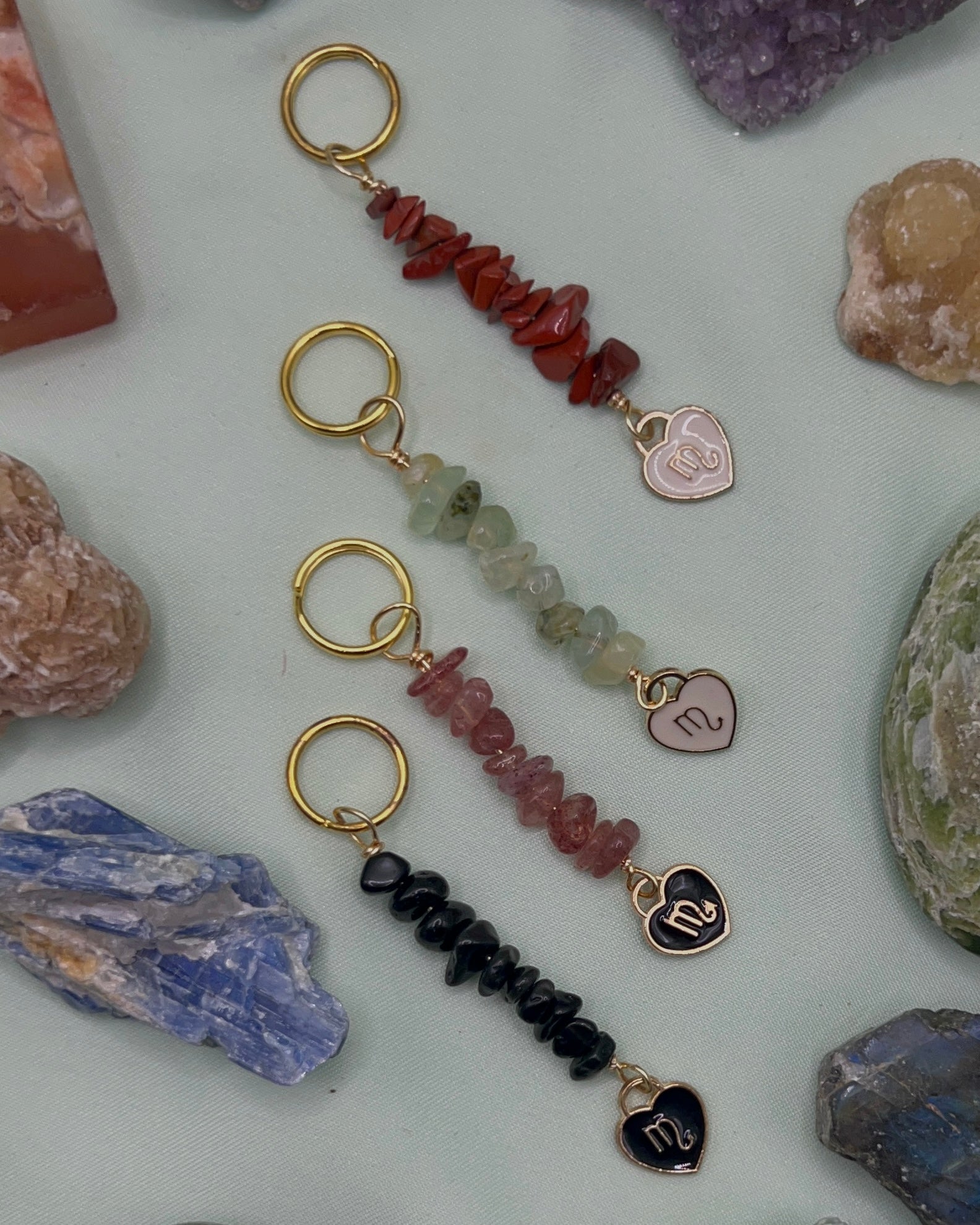 Gold plated keychain made with crystal chips and a Scorpio symbol charm. One of each available.