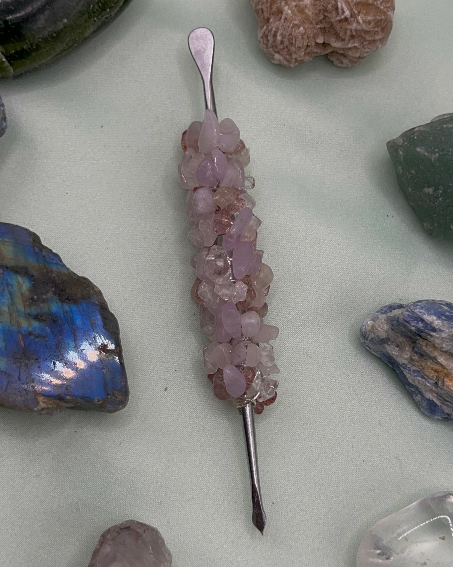 Dab tool wire wrapped with Rose Quartz, Strawberry Quartz, and Kunzite crystal chips. Only one available.
