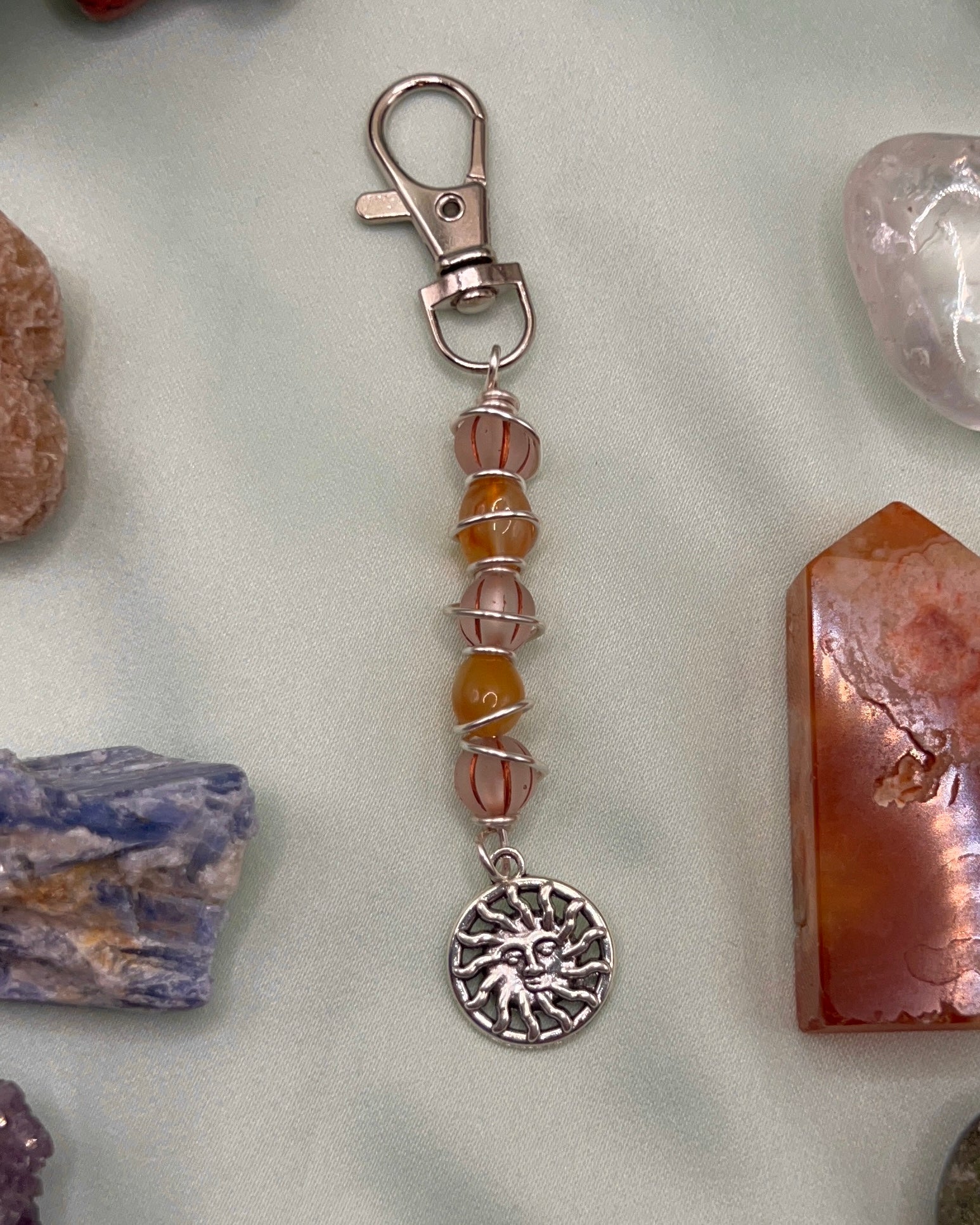 Keychain made with Carnelian pebbles and a sun charm. Only one available.