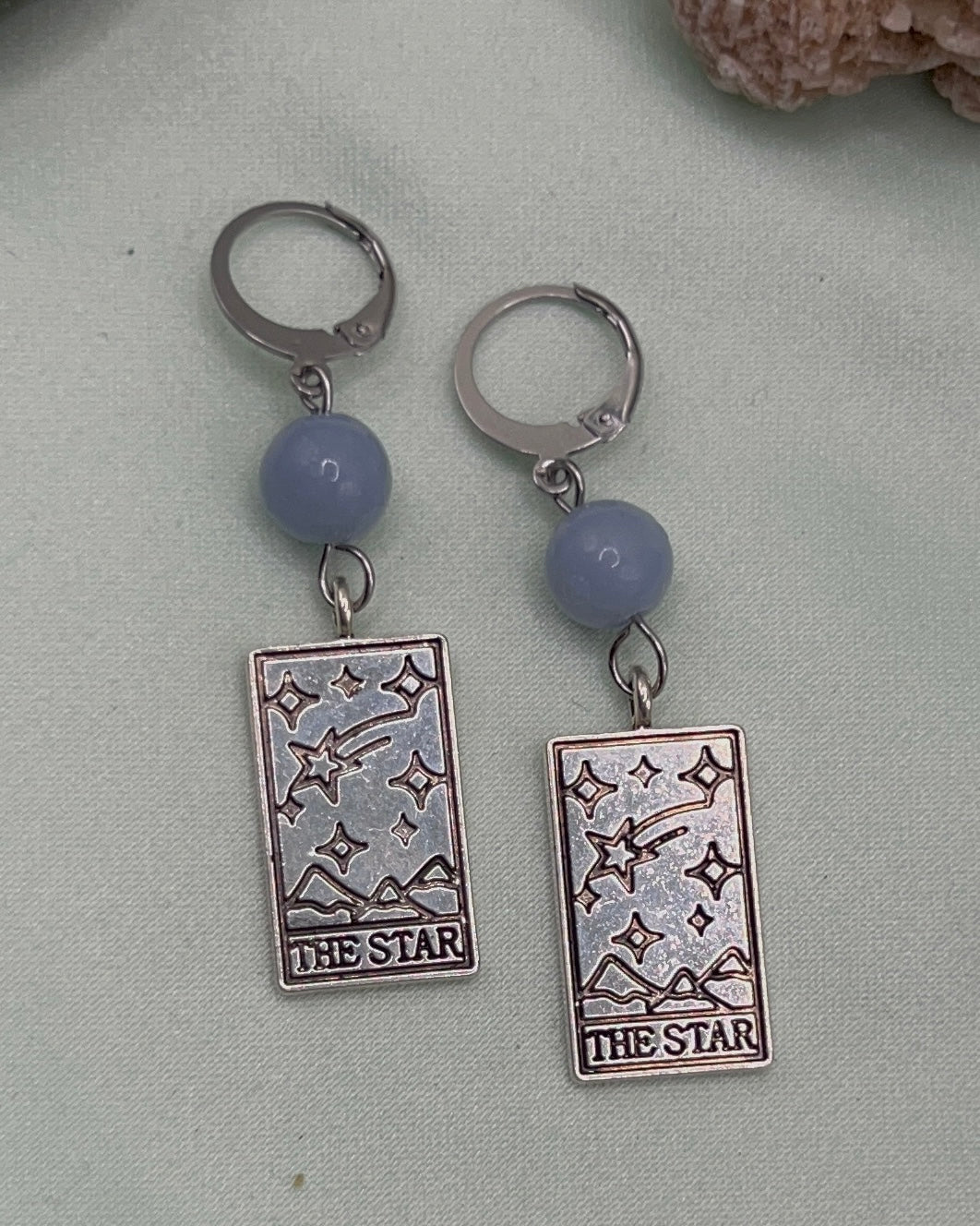Earrings made with Angelite crystal beads and tarot card charms. Comes on stainless steel huggie hoops. Only one pair available.