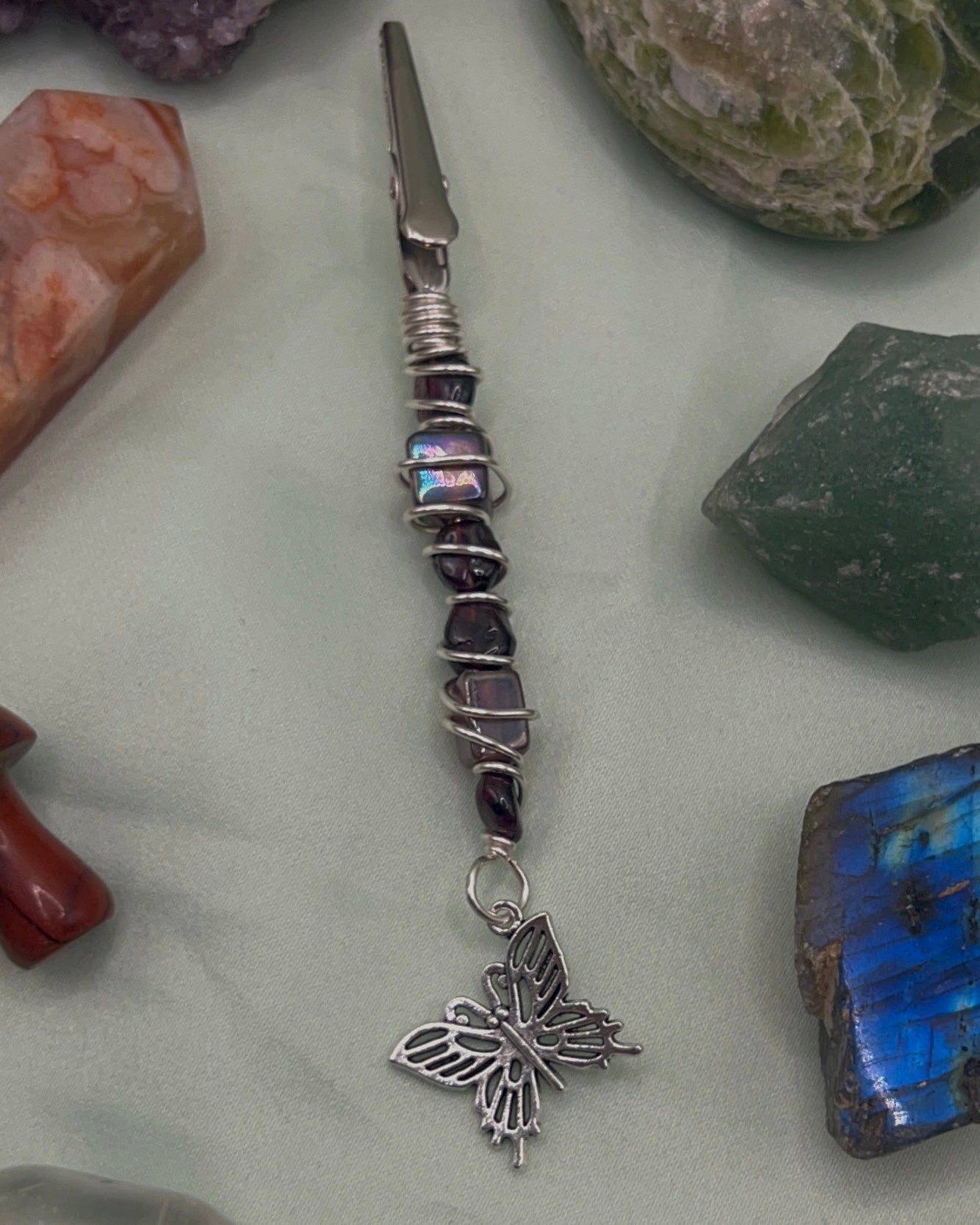 Alligator clip wire wrapped with Garnet crystal pebbles and a butterfly charm. Use clip to grasp cards or a roach. Only one available.