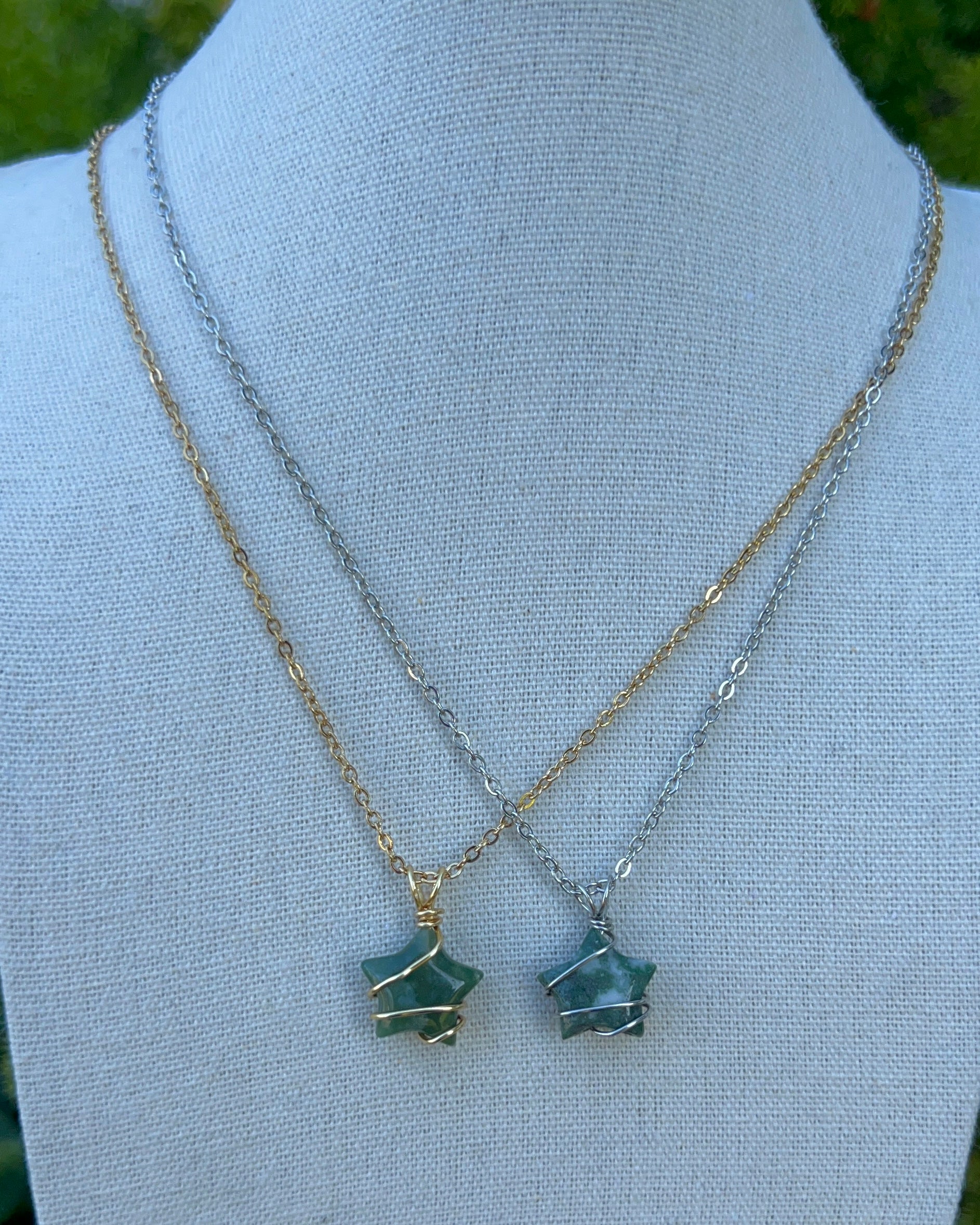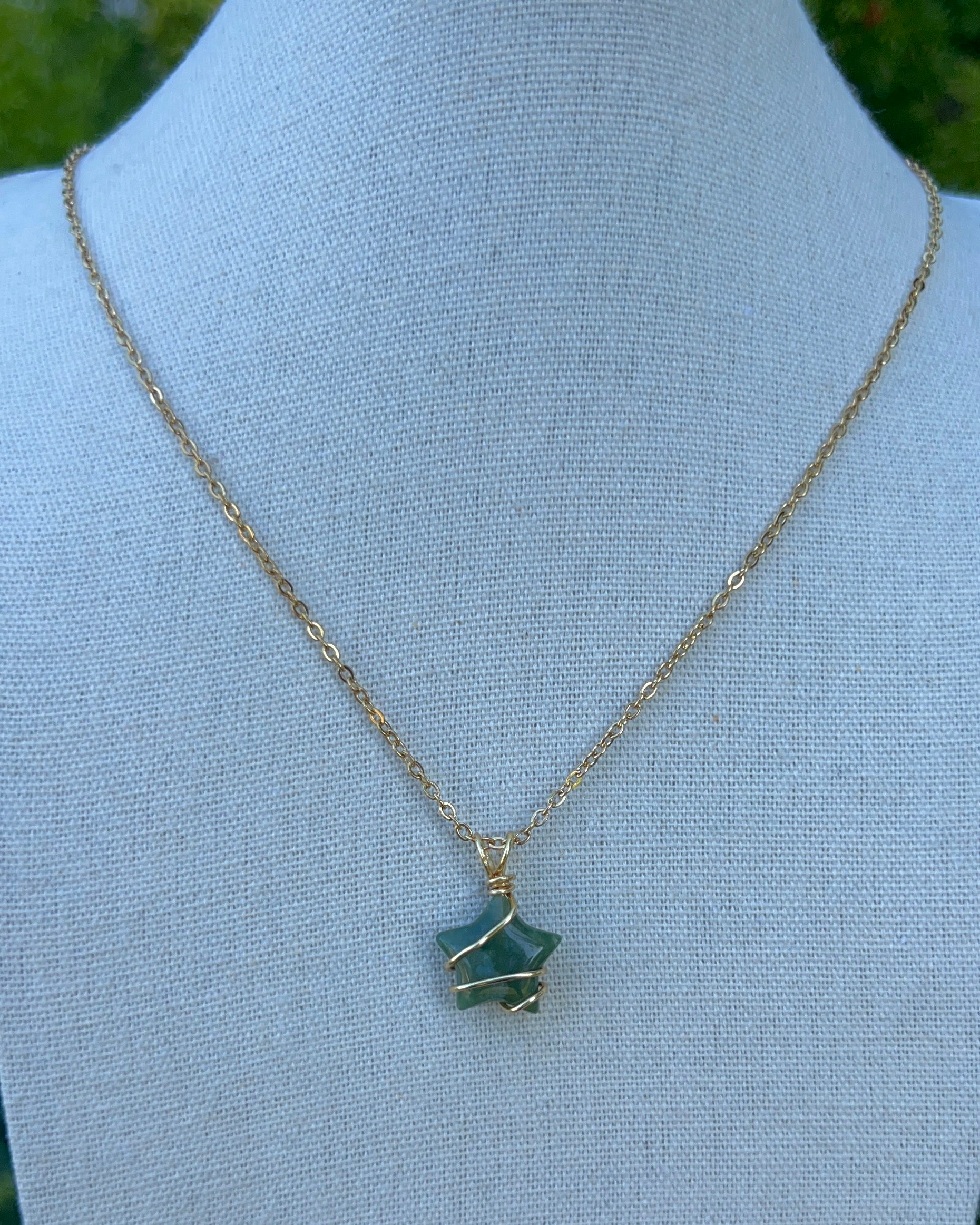 Necklaces made with a wire wrapped Moss Agate star. Made to order.